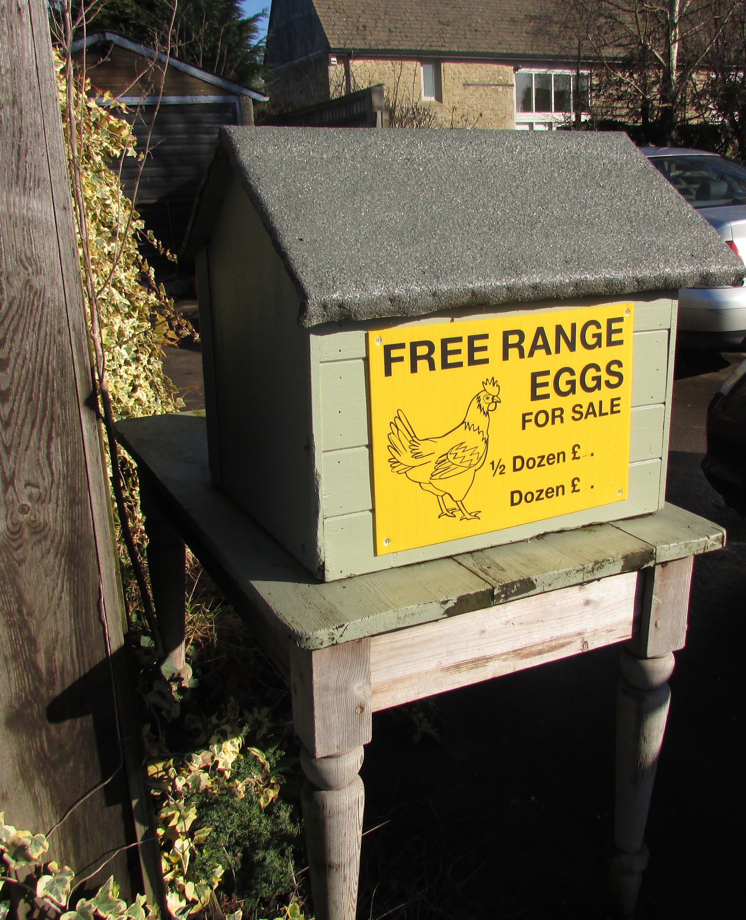 Honesty box eggsWhen you’re driving along a country road. The sun is beaming and it’s a crisp and cold almost Spring day. At the corner of the road is a sign with Free Range Farm eggs for sale. You pull up and there they are, probably laid that morning, half a dozen beautiful eggs, still with the fluff on ready and waiting to be bought for only £1.